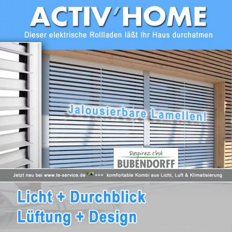 Mit dem jalousierbaren Rollladensystem Activ’Home von Bubendorff schaffen Sie stets eine angenehme Atmosphäre in den Innenräumen ohne wie bei einem "normalen" Rollladensystem auf Lichteinfall und Belüftung verzichten zu müssen. Schauen Sie sich bitte unsere Beispielabbildungen und Prospekte an, um das System kennenzulernen.