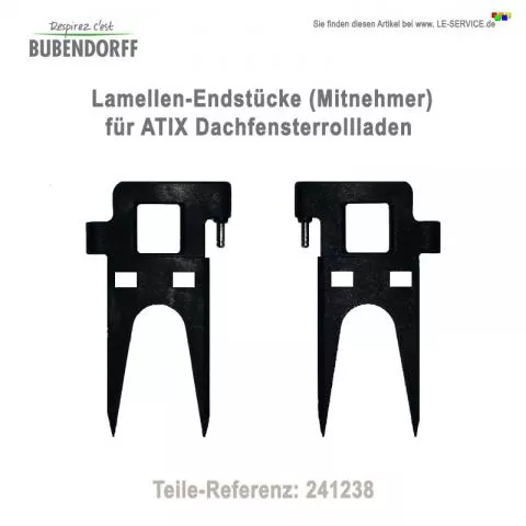 Diese Kunststoffendstücke sind die seitlichen Einsteckmodule an den Lamellen des ATIX Dachfensterrollladen. Original Ersatzteil Bubendorff. Die Endstücke bzw. Mitnehmer werden an den Seiten der Lamellen vom Rollladenpanzer angebracht und sind zur Führung auf dem Antriebszahnrad im Rollladen-Kasten des Bubendorff Dachfensterrollladen ATIX vorgesehen.