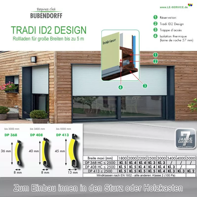 BubendorffTRADI ID2 DESIGN Rollladen - kein Rolltor - Lamelle 45 mm Breite bis 5 mDer TRADI ID2 DESIGN Aluminiumrollladen offene Montage ist ein elektrischer Rollladen aus Aluminium mit 45er Lamelle