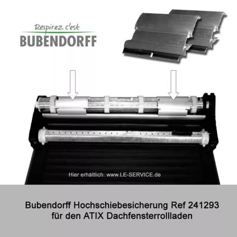 Die Hochschiebesicherung für den ATIX Dachfensterrollladen zum Einschieben in den Lamellenpanzer. Bubendorff Teile-Referenz: 241293 - automatische Verriegelung bei Versuchen, den Lamellenpanzer hochzuschieben und zu öffnen. Dient zugleich als Wellenverbinder (Wellenanbindung).