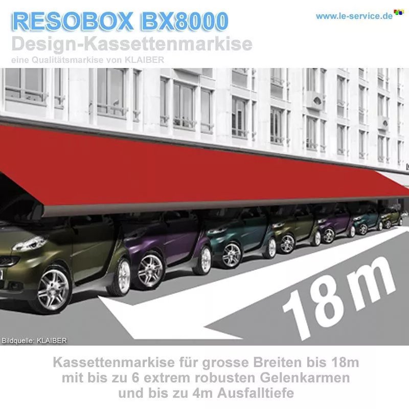 Die KLAIBER RESOBOX BX8000 ist eine komplett neu entwickelte Kassettenmarkise, welche neue Maßstäbe in Sicherheit und Design setzt. Die RESOBOX BX8000 bietet höchste Qualität und Stabilität in konkurrenzlosem Umfang.