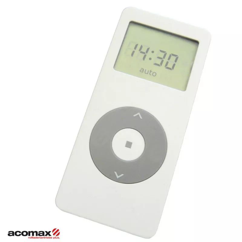 Funkschaltuhr 433 MHz. Funk-Rollladen-Zeitschaltuhr im Handsenderdesign mit Wandhalterung und Batterie. Einfache Programmierung der Fahrzeiten, Hand- und Automatikbetrieb, Zufallsgenerator.